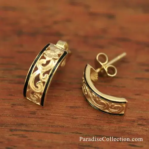 14kt Yellow Gold Cut-In Plumeria and Scroll Half-Hoop Earrings with Black Border